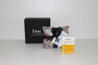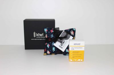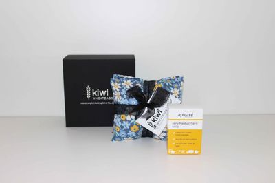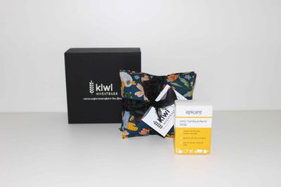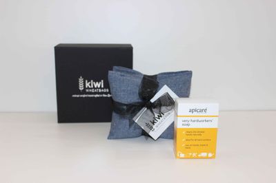 A Kiwi Wheatbags Cotton Wheat Bag (Ribbon Wrapped), and an Apicare Very Hardworkers Soap (both proudly made in New Zealand).