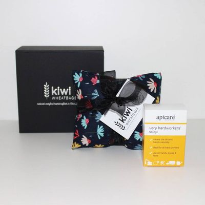 A Kiwi Wheatbags Cotton Wheat Bag (Ribbon Wrapped), an Apicare Very Hardworkers Soap, and an Apicare Very Hardworkers Hand Creme (all proudly made in New Zealand).